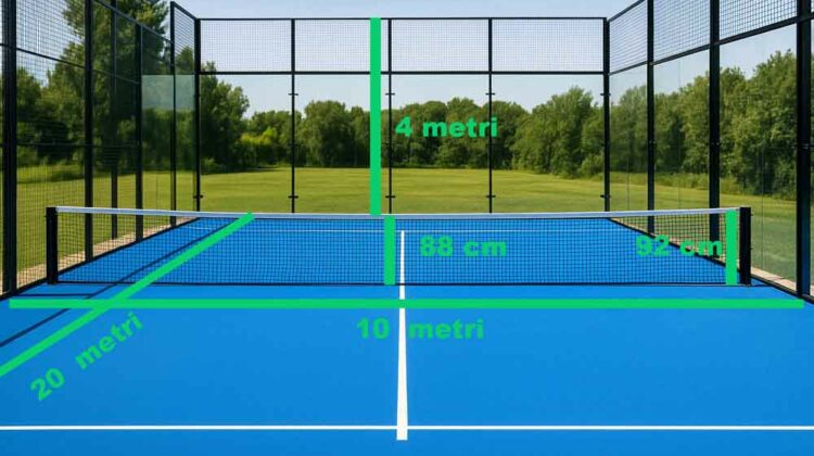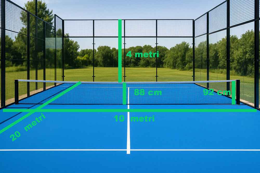 La dimensione standard di un campo da padel regolamentare è di 20 metri di lunghezza per 10 metri di larghezza. Questo spazio è suddiviso in due metà da una rete centrale alta 88 cm al centro e 92 cm alle estremità.